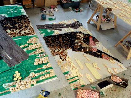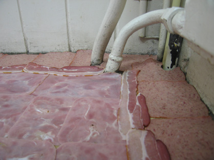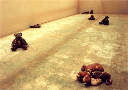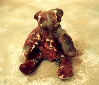 Meat teddies, Installation of meat, carpet, and cheesecloth, 250 x 800 cm, 1995