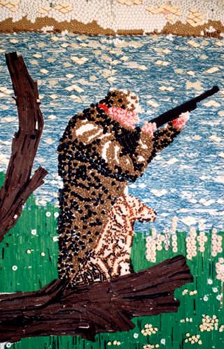 Hunter with dog, liquorice on wood, 204 x 330 cm, 2000