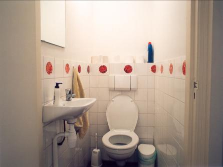 Toilet, toilet with tiles, print on tile, 15 x 15 cm, 2000