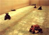 In gesprek met haar noemt ze twee oudere werken exemplarisch voor haar inhoudelijke ideeën en werkwijze. De installatie 'Vleesteddies' uit 1995 en een fotowerk 'Bloemen, kippen en poten' (90 x 60 cm.) uit 1996 laten volgens haar het duidelijkst zien waar het haar in haar werk omgaat. Mooibroek kreeg in die tijd oog voor de totale kunstmatigheid van onze leefwereld. "De beer, eigenlijk een gevaarlijk en groot dier, wordt getransformeerd tot een zachte troostende knuffel voor kinderen”, zegt ze sprekend over haar werk 'Vleesteddies'. Mooibroek woonde in New York en werd dagelijks geconfronteerd met artificiële subwerelden in onze directe leefomgeving. Het werk 'Vleesteddies' en ook andere werken gaan daarop in en bieden ons een confronterende en provocerende vermenging van deze doorgaans gescheiden subwerelden. In deze tijdelijke installatie, die ik alleen ken van de foto’s (hierboven) zien we 'knuffelbeertjes' gemaakt van lappenvlees, ze zitten eenzaam verspreid op een roze vloer van een afgesloten ruimte. Ik stel me voor, hoe je bij het betreden van de ruimte overvallen wordt door een zoete geur van bederf, vermengd met de negatieve sensatie van een verstoord kinderparadijs.