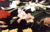 In het werk 'Bloemen, kippen en poten' wordt ons een samenkomst van leven en dood getoond. Gladiolen, dode kippen naakt en geplukt op een 'mooie' manier gerangschikt en geëtaleerd voor het oog van de camera. In dit fotowerk zien we een duidelijke verwijzing naar de vanitas symboliek uit de zeventiende eeuwse schilderskunst waarin doodshoofden, zandlopers en verwelkte bloemen verwijzen naar onze vergankelijkheid. Toch is dit werk meer dan alleen maar een knipoog naar de vanitas symboliek. Hier in dit stilleven (als foto) wordt de romantische natuur als een advertentie voor de consumptiewaar weergegeven.