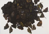 Ik zie op een witte of lichte achtergrond een hoopje vlinders. Zijn ze dood? Ik denk het wel.