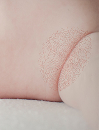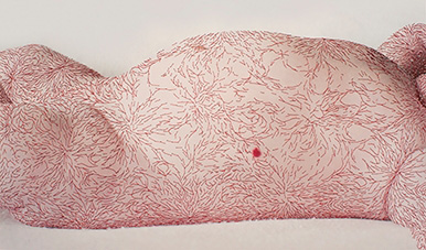 Onregelmatigheden werden niet weggewerkt, maar juist benadrukt, zoals moedervlekken, een vuurrode ophoping van adertjes, extra beharing en littekens. Daarna ging zij verder door hele patronen toe te voegen. Dat waren geen van tevoren overdachte patronen, zoals bijvoorbeeld bij tatoeages of bij schema’s van energiebanen in de acupunctuur. Het waren de zichtbare sporen van een intuïtief aftasten van de lichaamsrondingen. Zo ontstonden open, uitwaaierende patronen die lijken op sterren, bloemen of kristallen, verspreid over de bolling van een buik, arm of been. Ook overgangen tussen lichaamsdelen, zoals die tussen een dijbeen en een buik of tussen een arm en een romp werden benadrukt door een drukke opeenhoping van draden.