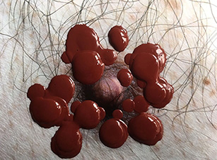 In een volgende fase is Eveline Mooibroek haar foto’s ook met verf gaan bewerken. Zij gebruikte daarvoor vloeibare acrylverf met een grote mate van viscositeit. Uitgangspunt waren de moedervlekken die zij op de door haar gefotografeerde lichamen tegenkwam. In plaats van ze weg te werken of te camoufleren ging zij de vlekken juist benadrukken. Dat deed ze met dikke druppels rode of roodbruine verf die ze voorzichtig uit flesjes liet vallen. Het werden er steeds meer en zo vormden zich patronen van stippen, kleine en grote, over alle lichaamsdelen.